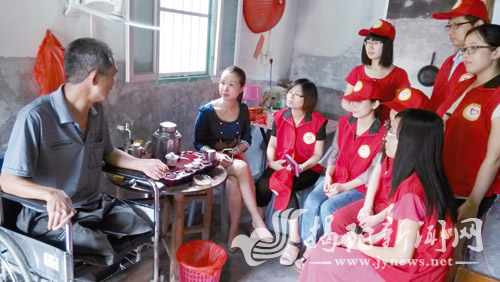 锡场镇敬老爱幼志愿服务队积极开展“送温暖,献爱心”活动,履行社会职责,赢得当地群众的称赞与好评。当得知该镇军埔村贫困残疾人黄洁雄有实际生活困难时,队员们纷纷赶赴其家中,帮忙干起家务活,扫地、擦窗、叠被子、清洁卫生,与他们谈谈心、聊家常(见图。池 妍 摄),不时给予鼓励,让他们重燃生活的信心。队员们真诚的微笑、热忱的服务,让贫困户感受到社会的温暖。黄洁雄激动地对记者说:“志愿者与我结下了深厚的感情,他们贴心周到的服务,让我乐观坚强地面对生活。”该队联合该镇妇联到锡场镇玉清宫开展一对一帮扶活动,尽力帮助贫困学生解决学习和生活上碰到的问题,真正用心关爱社会弱势群体的生活。