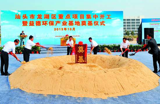 本报讯 记者周敏、张烈华,通讯员柯睿摄影报道:今天上午,龙湖区在珠津工业南片区隆重而简朴地举行2013年重点项目集中开工暨益德环保产业基地奠基仪式(见图)。此次龙湖区集中开工的重点项目共有24个,总投资达到223.78亿元,涵盖了基础设施、企业增资扩产、环保产业、商贸物流、酒店、医院、三旧改造及学校、市政道路建设等民生领域。市领导陈茂辉、郑人豪、黄俊潮、郑通声、李耿坚、谢铿等出席了仪式。