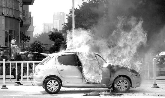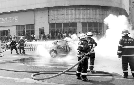本报讯(记者林子海 林鹏 摄影报道)“如同电影镜头一样,短短5分钟内,一辆崭新的轿车就烧成了一堆废铁!”昨天上午12时多,在市区金环金砂路红绿灯路口,一辆雪铁龙C2轿车突然起火燃烧,驾驶员见势不妙急忙逃出车外,大火最后被赶到现场的消防官兵等扑灭。目前,起火原因还在进一步调查中。