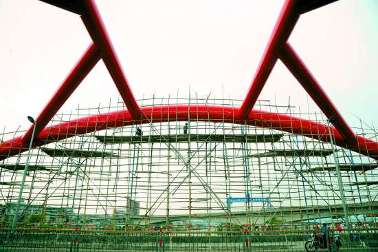 连接西港路和乌桥岛的光华桥是我市中心城区的主要交通桥梁之一。从上月底开始,市政设施维修中心对光华桥进行修补翻新,预计本月底翻新工作即可完成。图为主桥中心处两侧已经搭起了10多米高的施工竹架。 本报记者 李俊伟 方淦明 摄