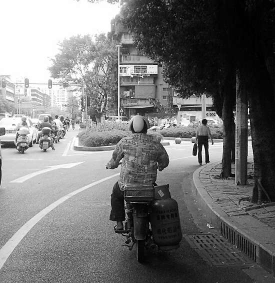 昨天,市民赖先生经过市区金湖路时,突然见到一位载着煤气瓶的摩托车驾驶员的头盔有些奇怪,仔细一看,原来那根本不是头盔,而是一整个柚子皮(见图)。看到这“雷人”的“头盔”,赖先生便随手将之拍下并上传到网上。