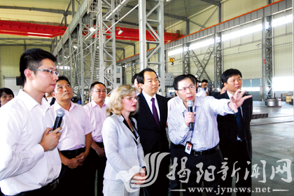 陈东向客人介绍了我市金属产业和中德金属生态城建设推进情况。他表示,李克强总理访德时提出,中国正在成长中的制造业和成熟可靠的德国制造业是珠联璧合,中德两国面临巨大的合作空间;今年7月,广东省委书记胡春华访德,指出广东与德国的产业有很强的互补性,合作潜力巨大,广东将对中德金属生态城项目给予大力支持,希望中德双方推动各领域务实合作;广东省省长朱小丹给予中德金属生态城项目具体的指导和推动。在这样的形势与机遇下,揭阳要与德为友、引德入揭、与德合作、共同发展,以金属产业的转型升级助力揭阳投身新一轮粤东西北地区大发展,将中德金属生态城打造成为中德合作的典范。