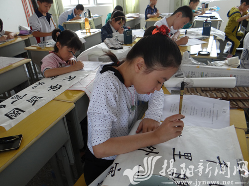 19日,全市中小学生“星河杯”现场书画大赛在榕城区实验学校举行,全市公办、民办中小学的150名选手参加比赛。