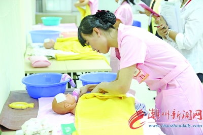 近日,潮州卫校师生代表队代表我市参加广东省人社厅主办的“海珠杯”广东省首届育婴师职业技能竞赛,荣获师生组团体冠军,其中,王秀莉老师在近百名参赛选手中脱颖而出,总成绩名列全省第一名。图为该校学生选手在竞赛中。施卫晓 摄