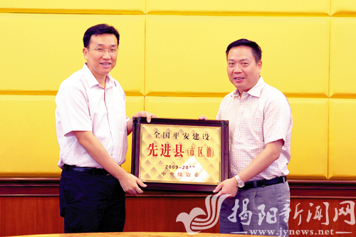 榕城区今年再次获得“全国平安建设先进区”称号,是粤东唯一一个获此殊荣的县(市、区)。10月17日,受省综治委委托,市委副书记、市社工委主任、市深化平安建设工作领导小组常务副组长谢峻代表市委、市综治委向榕城区授予“全国平安建设先进区”的金字牌匾。(见右图。通讯员 摄)这是对榕城区平安建设工作的充分肯定。
