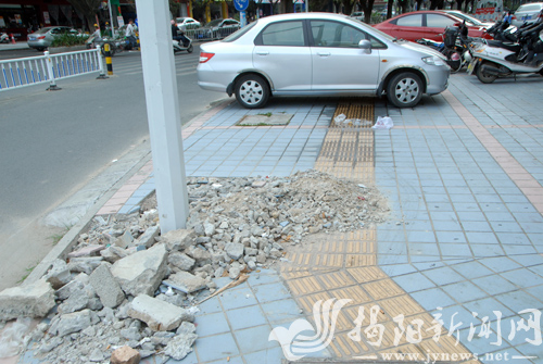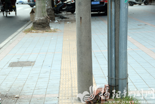组图:市区盲道被占用、紧贴电线杆等现象并不少见。郑楚藩 摄