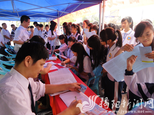 此次活动将由市人社局、省农信社揭阳办事处组织工作团队深入基层,走进校园,为全市部分中小学校教师和学生办理加载农信系统社保卡社保功能和金融功能的激活业务,并在校园内广泛宣传社保卡的相关知识,以学生、老师群体为先导,带动广大市民广泛学习、使用社保卡。11月1日,主办单位在普宁斗文中学举办了第一场活动,作为我市社保卡合作银行之一的普宁农信联社组织业务人员现场为该校师生提供服务,办理社保卡激活业务(见上图。邢晓荣 摄)。
