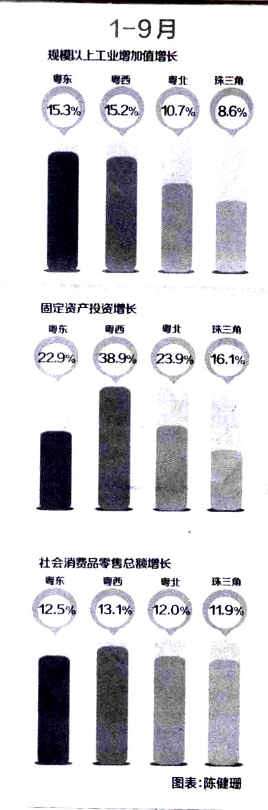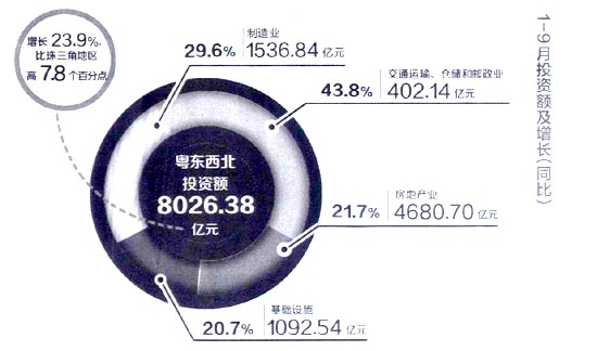 数据显示:1-9月,粤东西北完成投资8026.38亿元,同比增长23.9%,比珠三角地区高7.8个百分点。前三季度,粤东西北地区GDP增速比全省平均增速约高2个百分点。统计专家指出,促进粤东西北振兴发展决定的出台,比较突出的是推动资金向该地区投入和聚集,基础设施和房地产投资明显加快。湛江钢铁项目、中科炼化项目、中委炼化项目、厦深高铁等重大项目加快推进,新区规划和建设也加速推进。