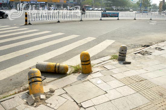 在黄岐山大道与建阳路交界处广百百货大楼对面,原先设置在人行道上的四个圆形石墩,其中一个已被连根拔起横躺在斑马线上,另一个也已严重倾斜。而同样的情况在沿江南路与北环城路交界处的人行道也存在,原先竖立在人行道上的石墩如今已躺在旁边的苗圃中,既影响市容市貌也存在安全隐患。在进贤门大道凤林村路口、莲花大道中段及黄岐山大道等路段中间的绿化带被行人踩出了一条条小道,部分绿地已出现黄土裸露,记者在现场不时看到有行人走“捷径”,有的甚至扛上自行车翻越绿化带,穿过来来往往的车流,让路人不禁为之捏了一把汗。而在建阳路、美阳路等多个路段的人行道上,路面也出现了不同程度的破损现象,这给过往行人带来了极大的不便。