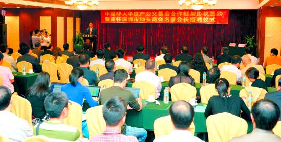 本报讯 (记者林馥盛)昨天上午,中国华人华侨产业交易会合作框架协议签约暨荣任深圳市汕头商会名誉会长授聘仪式在我市举行,市委常委、常务副市长郑通声与深圳市汕头商会会长郑汉明签订“中国华人华侨产业交易会项目”合作框架协议,这将有力充实“华侨经济文化合作试验区”的规划建设。市领导马逸丽、方展伟,深圳市汕头商会荣誉会长李茂水等参加活动。