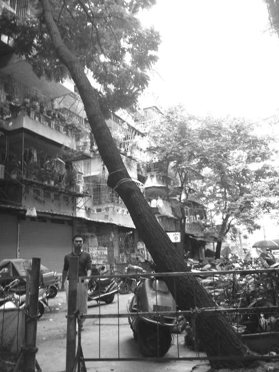 昨天下午3时多,记者来到事发地点,果然看到金新路62号住宅楼旁边一棵约有六层楼高的大树树身倾斜得很厉害,而且树头部分地方可见树根裸露,周围有的水泥板也被掀起来!更为令人担心的是,这棵胸径有0.4米左右的大树是向人来人往的通道严重倾斜的,而不少步履匆匆的过往市民并没有太留意这棵随时可能倒下的大树。