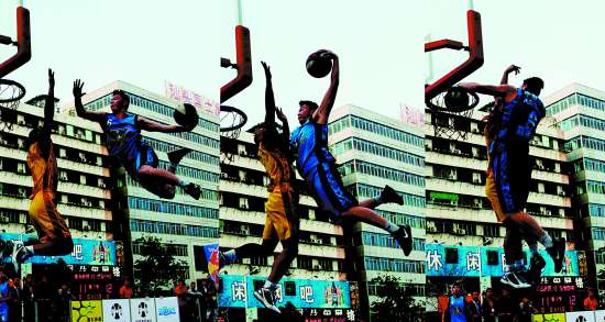 记者在现场看到,与普通的篮球场地相似,中国特技灌篮的场地也分为中、前、后场,包括两个标准篮球架及两条三分线,但与普通篮球场地不同的是,两条三分线内分别多了4块蹦床。篮球运动员也不像职业运动员一样“高不可及”,而就是普通的身高。但比赛一开始,这些运动员一下子就像灵活的兔子窜出去,在蹦床上一跳老高,一个精彩的灌篮,进球了!满场掌声雷鸣。 本报记者 曾漫路 苏硕元 摄影报道