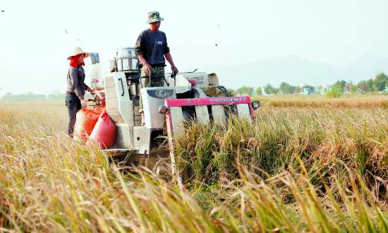 又到晚稻收割季节。当前,汕头各主要稻田种植区一片农忙景象。今年潮南、潮阳洪涝灾害和强台风“天兔”发生后,我市全力进行救灾复产工作,及时进行补种改种,消灭病虫害,预计全市晚稻产量仍保持稳定。图为莲塘片区农户雇用收割机在进行晚稻收割。
