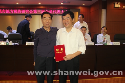 图为研究会会长刘岩为市地税局党组书记、局长姚小健颁发证书