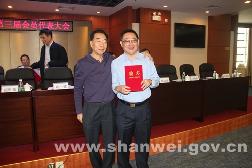 图为研究会会长刘岩为市委常委、常务副市长魏友庄庄颁发证书