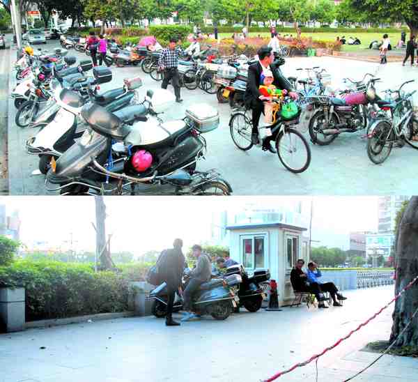 本报讯 市区时代广场、人民广场公众场所施行摩托车免费停放,这本是一个便民利民的的惠民政策,但记者走访中发现,因为免费停放,一些市民把车辆随意停放,而摩托车乱停乱放的混乱现象引起了盗车贼的觊觎,引发了盗车案件。记者就此进行了一番走访。