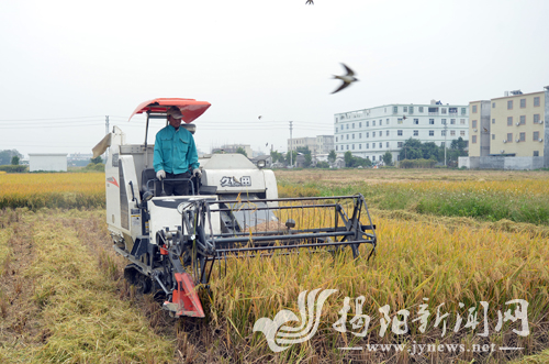 我市各地抓住近期天气晴好的有利时机,推进水稻收割进度,使晚稻及时收获,达到颗粒归仓。图为蓝城区月城镇寮东村农民正使用收割机收割水稻。记者 涂英鹏 摄