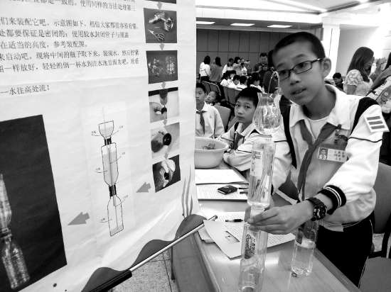 本报讯(记者 林彦恂 摄影报道)俗语有云,水向低处流。市芙蓉小学六年级学生王陈佳却用三个空矿泉水瓶和三根胶管,帮助水“克服”了地球引力,轻而易举地制造了“水往高处流”的奇特景象。在昨天举行的金平区第七届青少年科技创新大赛上,中小学生们运用所学知识,将看似异想天开的“点子”付诸实践,让大家叹服。