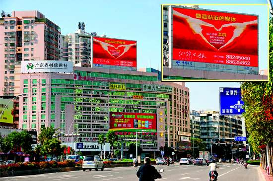 为进一步走近市民,亲近读者,在中国电信汕头分公司、澄海区委宣传部等的大力支持下,汕头日报编辑部制作了精美的形象广告,从昨天开始在中山东路与金环路交界处和国道324线澄海外砂桥头等处的大型电子显示屏每天轮番播出60次,“最权威”、“最专业”、“最贴近”等办报理念更加深入人心,广大读者更加真切地体会到《汕头日报》与他们贴得更近了。 本报记者 柯晓 摄