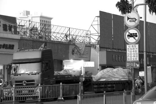 本报讯(记者 杨立轩 摄影报道)从本月20日起,我市广厦片区部分道路正式实施大型货车限时通行措施。昨天是限行令实施的第六天,记者在东厦北路及天山北路蹲点发现,下班高峰期的禁行时段内仍有大型货车违章行驶。