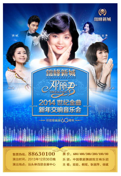 中国流行音乐走过了近百年的历史,循着步履匆匆的足迹,你无法绕开这样一个名字。 在华语乐坛上,她是一个传奇,在中国流行音乐史上无庸置疑她是承前启后、开宗立派的一代大师,她演唱的歌曲不仅是华人音乐经典,更成为人类文化的一部分,只要“有华人的地方,就有邓丽君的歌声”。她演唱的歌曲已经成为世界文化遗产的一部分,她以妙不可言的唱腔和完美的演唱技巧,带领人们走进真、善、美的艺术境界里。年华似水,十亿掌声依然如故,人们由衷地喜爱她,难忘她,怀念她。她的名字就是邓丽君! 歌后已逝,每每听到她的歌声,恍若隔世地想起自己青涩的初恋,那种安慰与甜蜜总是静静地温存在你心灵深处的每一个角落,她是一个杰出的女性,更是我们每个女性心中的偶像…… 邓丽君世纪经典金曲新年交响音乐会2013年12月30日将在林百欣会展中心隆重上演。此次演出伴奏有交响乐,民乐及电声乐等大型组合,更有获得全国青年歌手大赛最佳新人奖的桐瑶,央视王牌栏目《星光大道》总决赛节目获得季军的娃娃,中国大陆唯一获得台湾邓丽君基金会的男歌手——许斌,中央电视台“第十届全国青年歌手大奖赛”专业通俗唱法银奖的耿丽萍助阵。 有着中国歌剧舞剧院交响乐团作班底,精心打造了这台充满浓浓爱意的怀旧经典金曲演唱会。不仅是对一代歌后的祭奠与缅怀,向一个文化传承的使者致敬,也是让曾经懵懂少年的你我而如今已是社会栋梁的我们、他们再次聆听经典,感悟漫步人生路的心灵之旅让我们在那甜美的歌声里共同渡过浪漫而有温情的跨年夜。 音乐会上将会重现怀旧经典金曲,打造精美的舞台造型、绚丽的灯光渲染、时空交错的视频影像,在那柔美的嗓音中带你走进那个令人怀念的时代,感受天籁之后的艺术魅力,甜歌天后六十诞,风华绝代音犹在…