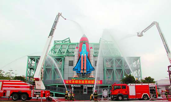 为进一步加强我市综合应急救援队伍建设,全面提高我市应急救援能力,昨天上午,由市政府与市公安消防局联合在汕头方特欢乐世界蓝水星举行“汕头市综合应急救援演练”。