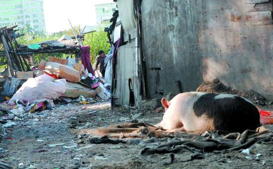 据泰山路旁的龙腾禧园住户反映,近来每逢晚饭时刻,附近菜地中的猪舍就会飘出阵阵异味,蚊蝇也特别多,总是飞进家里流连,让人不胜烦恼。而在菜地旁的几间工业厂房有关人员也反映,猪舍每天煮猪食时产生的呛人白烟以及四散的灰烬,还会随风飘进厂区宿舍,让员工们叫苦不迭。据一工厂行政主管介绍,养猪人多半来自安徽,他们为了节省成本,煮猪食的燃料并非柴草,而是四处收集来的薄膜、破旧衣服等。