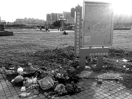 记者近日走访发现,火车站广场外围的路面还算整洁,但偶尔还是可以看到几张被随地丢弃的纸屑,起风时,它们就“翻着身”、“打着滚”地“奔跑”在马路上。一走进站前广场又是另一番景象,烟头、纸屑、食品包装袋等垃圾被随意丢在地上,几台“摩的”停在广场中心,驾驶员坐在车背上悠闲地磕着瓜子,而后将瓜子壳随手一扔,好不潇洒。各种各样的垃圾平铺在草地上,将原本用于美观绿化的草地变成了“彩地”,就连专门用于收集垃圾的垃圾桶周围也不能“幸免”。临近火车站阶梯的地方竖立着一块由市旅游局印制的带有汕头地图的宣传牌,上面写着“中国优秀旅游城市汕头欢迎您!”然而在这块牌子的下方却堆起了一座“垃圾小山”。