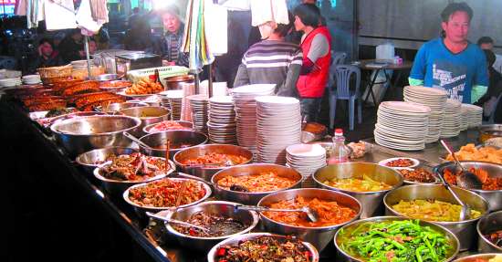 一家经营@条面的老板告诉记者,做夜宵生意过的就是颠倒黑白的生活,白天在家休息,下午晚些时间才开始洗食材、熬汤,到晚上10点左右才出来摆摊,客流多的时间集中在10点到12点、凌晨1点到2点之间,所以他们一般都要忙到凌晨3点才打烊。相对这些@条面、肠粉等小摊生意来说,小炒夜宵摊就显得“财大气粗”,在长平路的一间夜宵摊,记者看到,推车上摆着的食材包罗万象,有水产、蔬菜,也有卤味、杂咸,摆出来的桌子也有十来张,食客们络绎不绝。摊档伙计介绍说,来光顾的大多是上夜班的人,有时因为要通宵工作,必须吃饱点才有精力过夜。