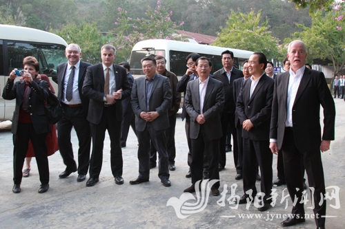 中德金属生态城创新发展探求座谈会今天在我市举行。7日,出席座谈会的中联部副部长李进军、德国驻广州总领事高思范(Stefan Gallon)等领导和嘉宾到我市有关地方参观考察(见图。杨继斌 摄),对我市经济社会快速发展给予高度评价,认为我市在发展特色产业、推动传统产业转型升级、加强国际合作等方面都具有前瞻性,取得重大成就,揭阳发展潜力巨大,发展前景广阔。市委书记、市人大常委会主任陈绿平,市委副书记、市长陈东等参加活动。