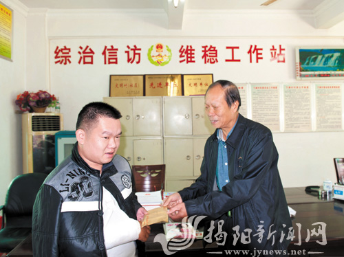 12月5日上午,市见义勇为基金会副理事长、秘书长孙潮列带领慰问组一行,在揭西政法委和河婆街道办事处负责人的陪同下,专程来到河婆街道下滩村,慰问见义勇为积极分子张庆辉(见图李维照 摄),赞扬他不畏危险,敢于同违法行为作斗争的行为,并送上慰问金。