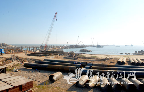 中海油粤东LNG项目一期建设规模200万吨/年,投资约100亿元,计划2016年投产,工程开工以来进展顺利。图为LNG码头建设场面。