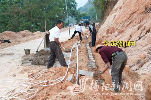 揭西县坪上镇西坑村地处山区,山路崎岖,弯弯曲曲,村民出入十分不便。今年来,坪上镇和西坑村的干部群众积极发动外出乡贤和社会各界出钱出力,共同把西坑村道修建成水泥路面。在外出乡贤黄先生鼎力资助和带动下,社会各界共筹集了100多万元,投入长近2公里、宽近5米的西坑村道水泥路面建设。图为数十名当地群众正在修筑水泥路面的路肩和排水沟。李维照 蔡忠东 摄