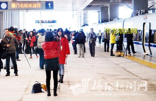 在终点站厦门北站,参加体验的媒体记者纷纷拍照留念。郑楚藩 摄