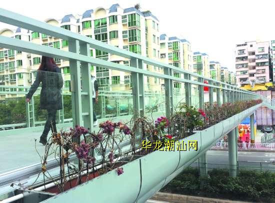本报讯(记者黄泽春 摄影报道) 作为市区第一座钢结构人行天桥,金砂东路人行天桥自上月初开放以来,为不少过往市民提供了方便,其美丽壮观也赢得了大家连声称赞。不过,昨天有热心市民向记者反映,这座新天桥主桥两侧摆放的成排盆栽大部分已出现枯萎,简直成了“干花”,真是大煞风景。
