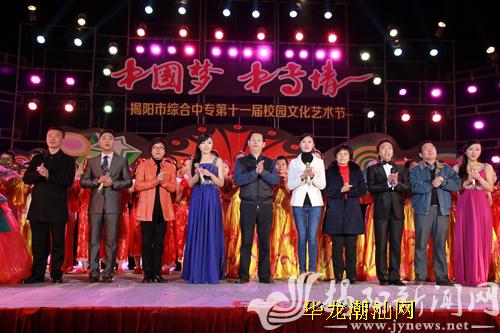 当晚8时,晚会在一曲气势磅礴的潮州大锣鼓《鼓鸣盛世》中拉开序幕。接着,欢快的舞蹈、幽默的三句半、美妙的歌声、经典的潮剧选段、精彩的武术表演、激情昂扬的诗朗诵、饱含感情的合唱等一一登台亮相,高潮迭起。师生们满怀豪情,现场气氛十分热烈,校园里一片欢歌笑语,大家都沉浸在美的文化艺术享受中。在约一个半小时的时间里,市综合中专的师生们用自编自演的节目尽情展示多才多艺的风采,展现了校园文化生活的五彩缤纷、蓬勃向上,体现了广大师生锐意进取的精神风貌、满怀奋进的豪情。在晚会接近尾声之际,陈绿平等市领导走上舞台,同演出的师生深情合唱《歌唱祖国》。