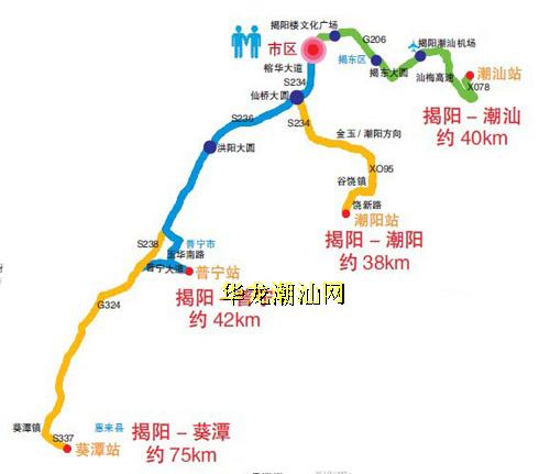 1、往潮汕站:从揭阳市区出发,经国道206、机场路,在汕梅高速公路登岗出入口上高速,在潮州沙溪出入口下高速,左转进入县道078线,经“宝山中学”路口、沙溪镇政府,进入站前路。