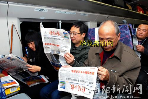 当天早上,揭阳日报社普宁记者站11位派送员来到普宁站,将1000多份报纸分批送到候车大厅里的乘客手中。同时,随车采访的记者带着100多份《揭阳日报》在普宁站乘上动车,把报纸免费分发给车厢里的旅客。乘客们争相传阅,现场读得津津有味,称赞《揭阳日报》对厦深铁路正式通车的报道快速及时、内容翔实,服务周到。