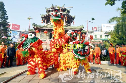 1月31日,农历大年初一,广东揭阳榕城区青狮文化保护中心在市区进贤门举行青狮表演,欢庆新春佳节。青狮也叫“开口狮”,是独具潮汕地区特色的传统狮。新华社 发(涂英鹏 摄)