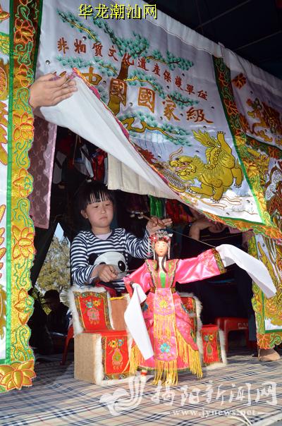 “五湖朦朦春正晓,仙风习习红尘渺……”在揭阳楼文化广场上,渔湖老赛宝木偶剧团团长孙树忠一边敲着锣鼓,一边唱念潮剧《十仙庆寿》,而8岁的王思婷则聚精会神在表演。