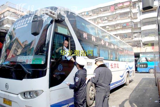 民警向客运车辆驾驶人员派发交通安全宣传资料 。