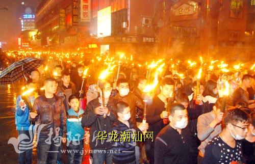 5日晚上,天空虽然飘着小雨,但阳美玉都却是一片欢乐的海洋,万人游行队伍中燃起无数火把,仿佛成了一条舞动的金龙。据了解,蓝城区阳美村每年农历初六晚都举办“阳美火把节”大型文艺游行民俗活动。郑楚藩 摄