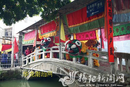 榕城南门是古榕城对外水路交通的重要码头,也是揭阳古八景“南浦渔歌”之所在,榕城南门孙氏自古以来就有舞青狮闹新春的习俗,每年的正月十一起,南门的各座桥梁就张灯结彩、喜气洋洋迎接四面八方的市民前来行彩桥,欣赏精彩、惊险的舞狮表演。
