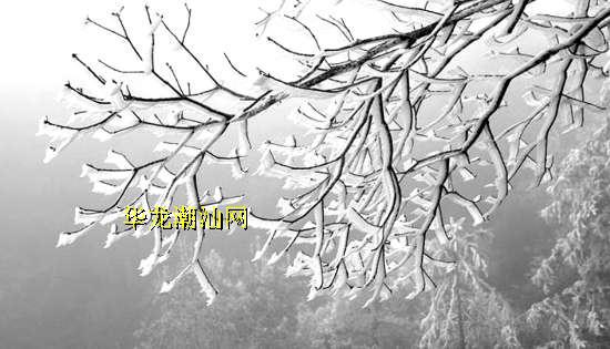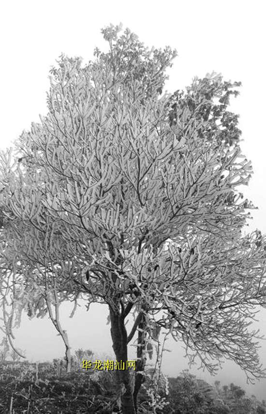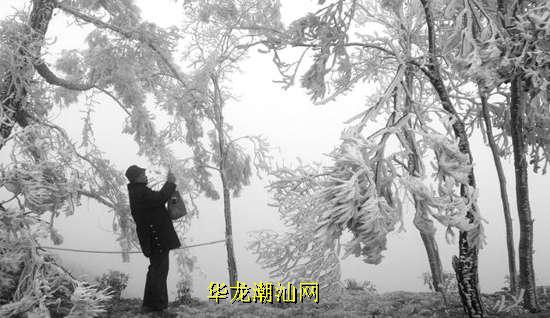 拍摄当天,文先生沿着凤北公路往山上进发,没过多久就看到霜冻现象,公路两旁的树枝均结满厚厚的霜。到了海拨较高的青麻园,能见度降至30米左右,霜冻现象更为壮观,四周的绿树及黄土都变成一片白色奇景,银装素裹的画面犹如北国风光,让他有种置身雪中的错觉。虽然凤凰山上未有下雪,但这次大面积的霜冻同样让文先生这名在凤凰镇生活了数十年的潮州人惊喜万分。文先生告诉记者,作为一名摄影爱好者,凤凰山是他日常关注的题材之一,此前已多次登山拍摄。而早在1999年的寒冬,他就曾拍下凤凰山上天池结冰的相片,不过当时并没有出现大面积霜冻。而这次寒流来袭,天池还未有结冰,山上就出现了霜冻景象,面积之大更是过去10多年首次出现。(图片由潮州华园相馆提供)
