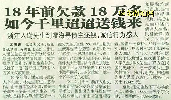 本报讯 记者陈史摄影报道:昨晚,中央电视台《新闻联播》以“千里寻人只为还债”为题,报道了浙江温州商人谢岩斌欠债18年后终于找到了二名我市澄海区的生意伙伴,成就了一段“苦寻债主”归还18多万元欠款的佳话。谢岩斌的诚信与两名债权人辛扬德、林榜雄的豁达、宽容,感动了无数人,澄海区委、区政府号召全区人民向他们学习。