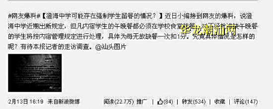本报讯 (记者蔡毓生 见习记者翁夏 陈冬琪)近日,有澄海中学学生通过本报官方微博爆料,向本报反映关于澄海中学将内宿生在校用餐考勤纳入内宿管理规定的突出问题。2月13日,本报官方微博发布了题为“澄海中学可能存在强制学生留餐的情况”的微博,至记者发稿时,已引发近600次的转发和近300次的评论,网上阅读量达25.5万,本报官方微博一日增加粉丝数200个,澄中网友更发起微博话题#帮澄中上头条#。昨天下午,记者专程赴澄海采访,与部分学生进行面谈,核实投诉内容,并实地走访澄海中学食堂,请校方就同学们反响比较强烈的几个焦点问题进行公开回应。