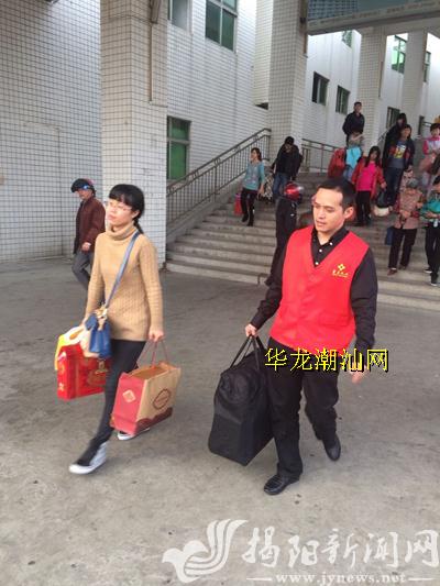 当天下午4时52分,大批返揭乘客涌出车站。志愿者有的上前帮旅客搬提行李、指引道路;有的引导乘客,维持现场秩序;火车站出口的“幸福驿站”服务站设置有手机充电器,配备了方便面、药箱等物品,为有需要的乘客提供免费服务。
