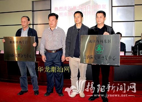 仪式上,揭东区卫生局、区残联有关负责人为区第一人民医院、区第二人民医院授予“揭东区白内障复明康复中心”定点医院牌匾。