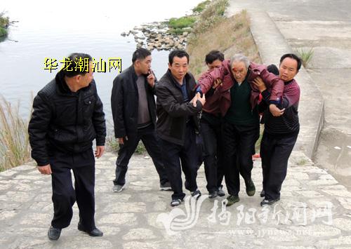 当天上午9时多,一位妇女的呼救声惊动了正在揭西县棉湖镇郊区水门堤防上的行人,循声看去,只见一位老人正在离堤面10多米的陡坡水渠边挣扎,老人的下半身已跌落水中,脸上流着血,一只手紧抓着石壁上的草丛,情况十分危急。一位骑单车带着2个小孩路过的群众见状,立即把小孩托付给路人照看,自己急忙跑下沟渠,把老人从水边拉上来,抱上3米多高的水渠面。这时又有几名闻讯赶来相助的路人,有的脱下身上的棉袄给老人御寒。幸好老人跌下时只是擦伤面部,神志尚清醒,能够说出家人的电话,于是,有人立即打电话告知其家属,然后大家合力把老人扶上陡峭的河堤。一位姓沈的群众开车路过,不仅热情地参与救助,还和大家把老人扶上自己的轿车,和随后赶到的老人家属一起把老人送回家里。