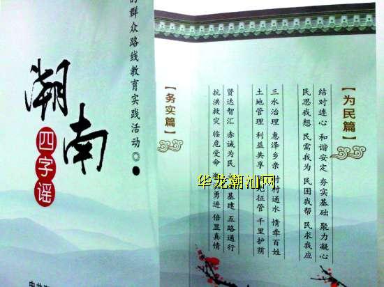 在启动党的群众路线教育实践活动后,潮南区委宣传部门创新形式,创作了《潮南四字谣》,并印发1万多份,分发给全区各地党员干部。记者了解到,党的群众路线教育实践活动“潮南四字谣”分为概论、为民篇、务实篇、勤廉篇四部分,内容涵盖民生、产业、文化等方面工作写照,突出对党员干部践行群众路线的具体要求,出发点和落脚点。整篇“潮南四字谣”四字一句,平仄押韵,短小精悍,朗朗上口。不仅语言上通俗易懂,韵律上也抑扬顿挫。广大干部群众纷纷表示,用艺术的手法和群众的语言创作的“四字谣”,不但使党的群众路线的相关政策和精神变得易懂,也便于群众传唱,易懂易记,让党的群众路线教育实践活动有关政策以及潮南区的工作写照在广大党员干部中入脑入心。